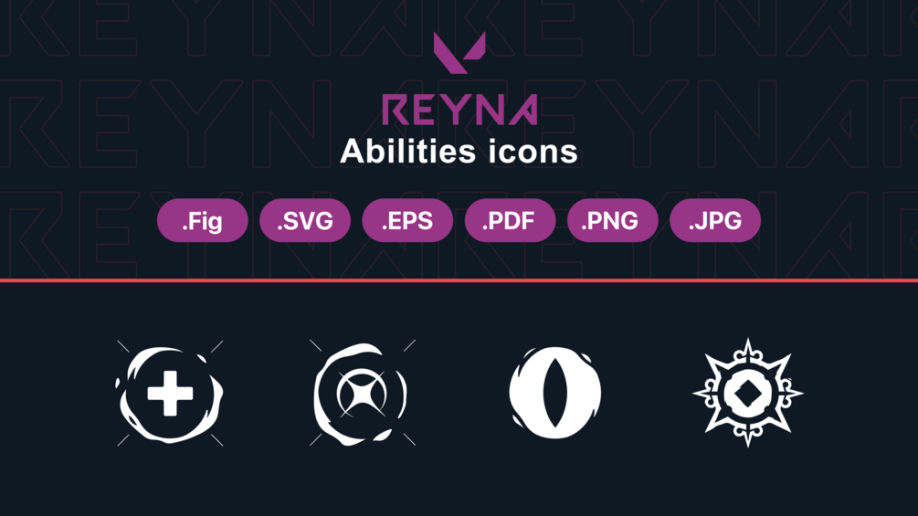 Our digital download offers high-quality SVG, PNG, EPS, Figma, PDF, and JPG files of the Reyna Agent Abilities icons, perfect for any gaming enthusiast or graphic designer.
